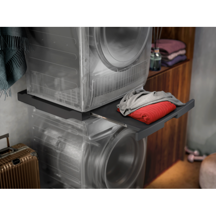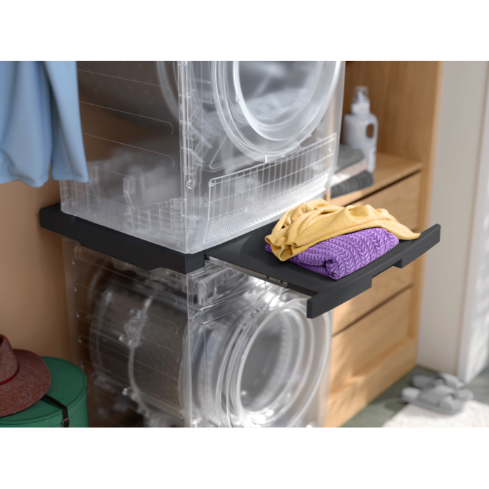 Su mūsų sujungimo rėmeliu galite lengvai sumontuoti džiovyklę virš skalbimo mašinos. O įmontuota stumdoma lentyna leidžia ją naudoti lengvai. Tinka visoms „Electrolux“ skalbimo mašinoms ir džiovyklėms su priekiniu pakrovimu, kurių gylis yra nuo 52 iki 67 cm.