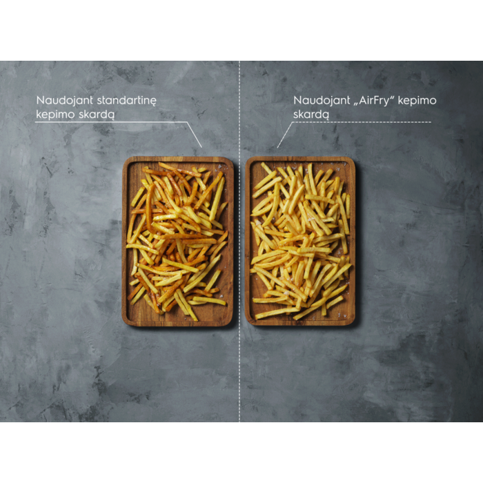 Mėgaukitės traškiu ir tolygiai iškeptu maistu, pavyzdžiui, bulvytėmis, daržovėmis ir vištienos sparneliais, su nedideliu kiekiu aliejaus arba visai be jo, naudodami „AirFry“ orkaitės skardą. Specialiai sukurta tinklinė struktūra užtikrina geresnę oro cirkuliaciją ir nuolatinį oro srautą. Nereikia apversti maisto.