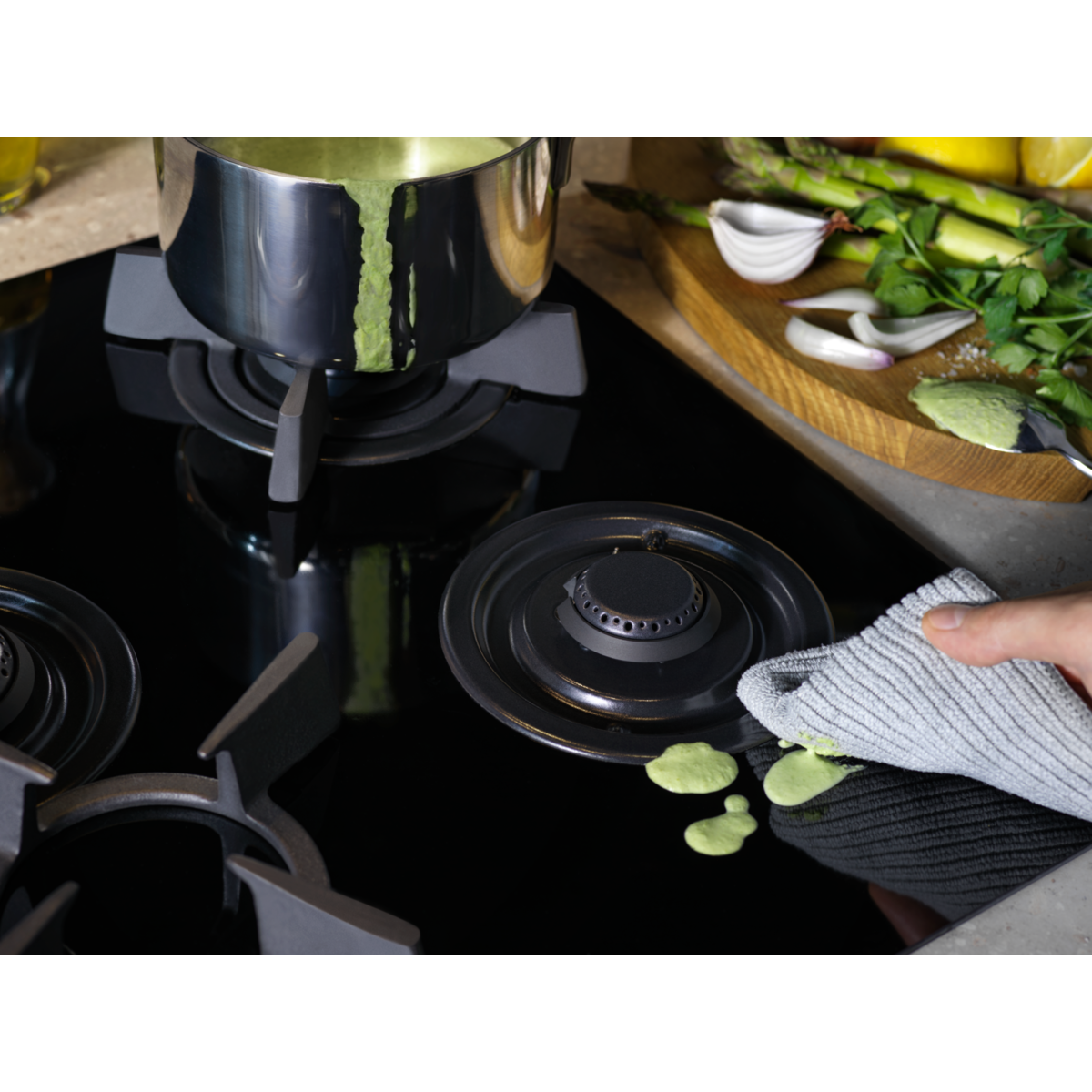 Spartusis degiklis „Electrolux“ kaitlentėje „Gas on Glass“ greitai pasiekia puodų ir keptuvių apačią. Spartesnis ir intensyvesnis kaitinimas sutaupant iki 20 % energijos.