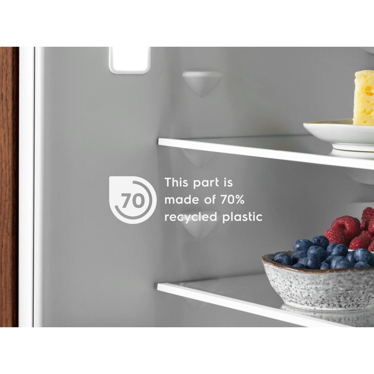 * Vidaus dangos plastikas rHIPS yra pagamintas panaudojant iki 70 % perdirbto plastiko, o tai sudaro 13 % viso šaldytuve esančio plastiko.