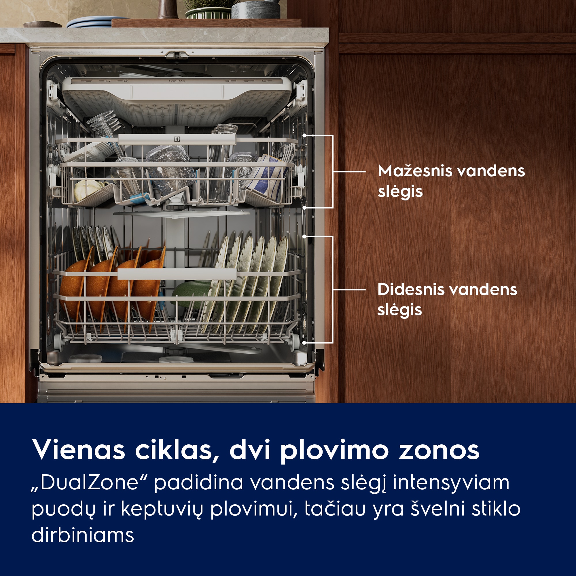 1 ciklas, 2 zonos. Intensyviai valo puodus ir keptuves, tačiau švelni taurėms