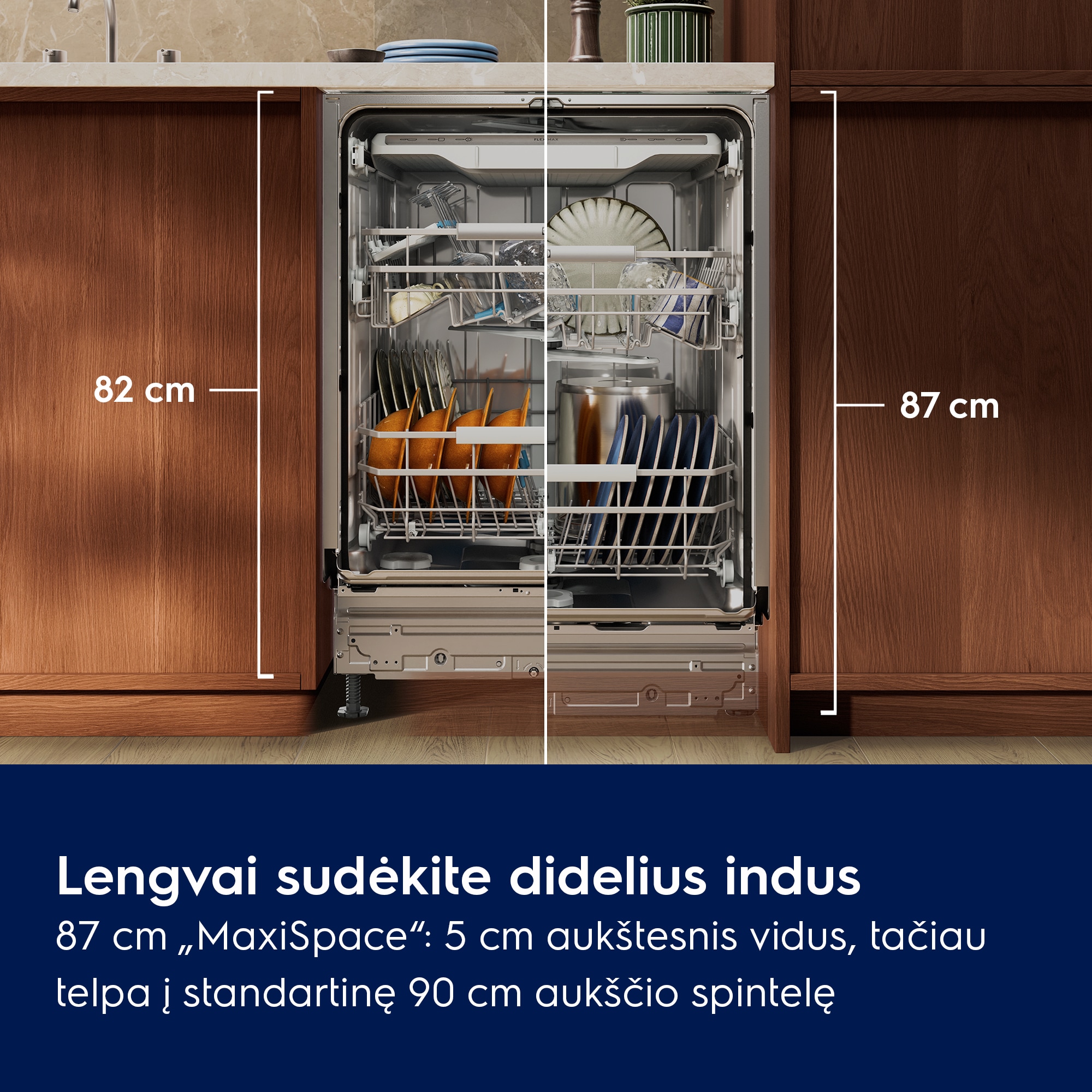 5 cm aukštesnis 900 serijos „MaxiSpace” vidus puikiai telpa į standartinę spintelę. Erdvūs, universalūs krepšiai talpina grafinus, taures ir net sriubos dubenėlius. Įrankių padėklas pritaikytas mažiems puodeliams. Galingas plovimas pašalina įsisenėjusius maisto likučius nenaudojant daug vandens.