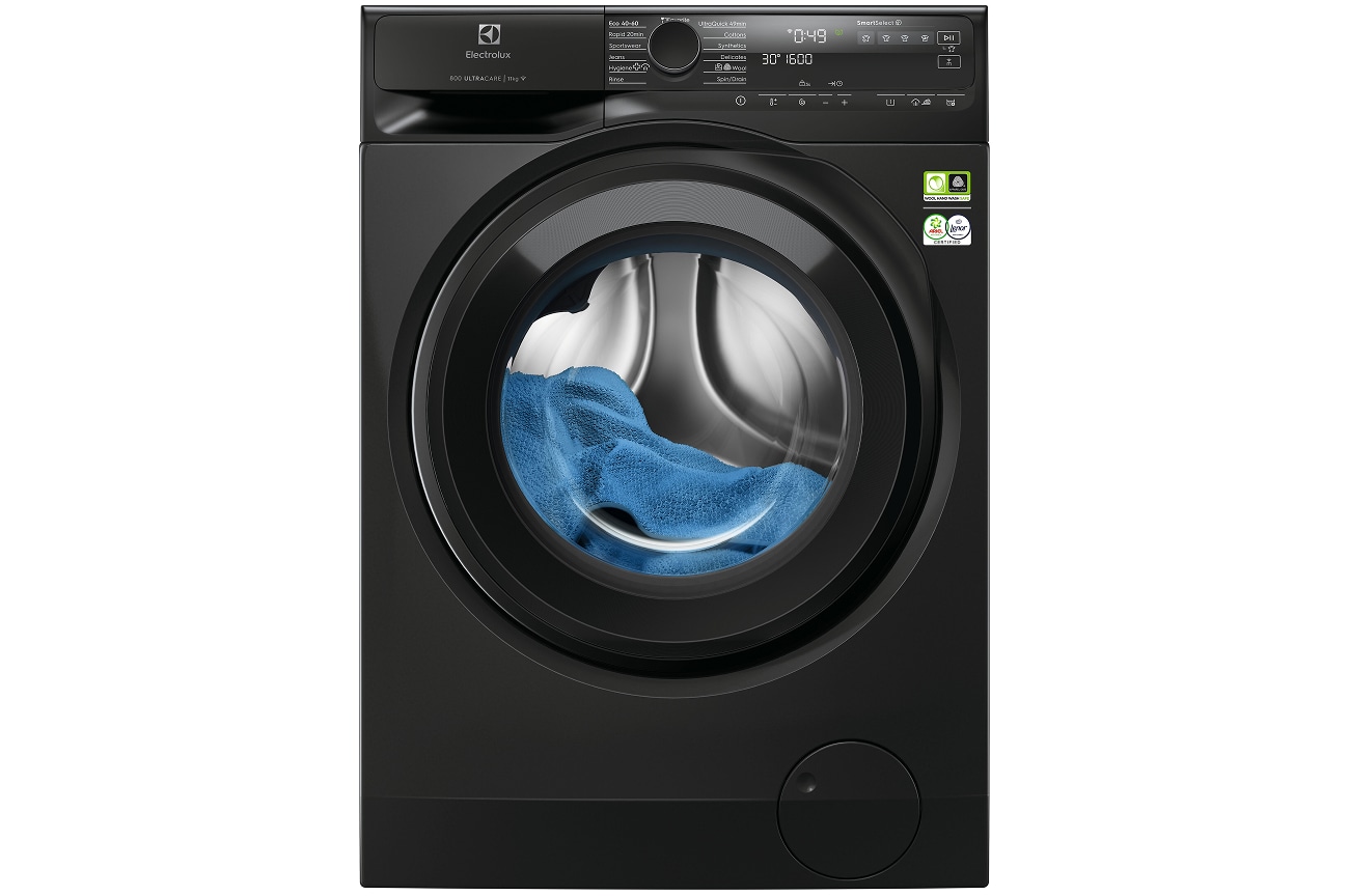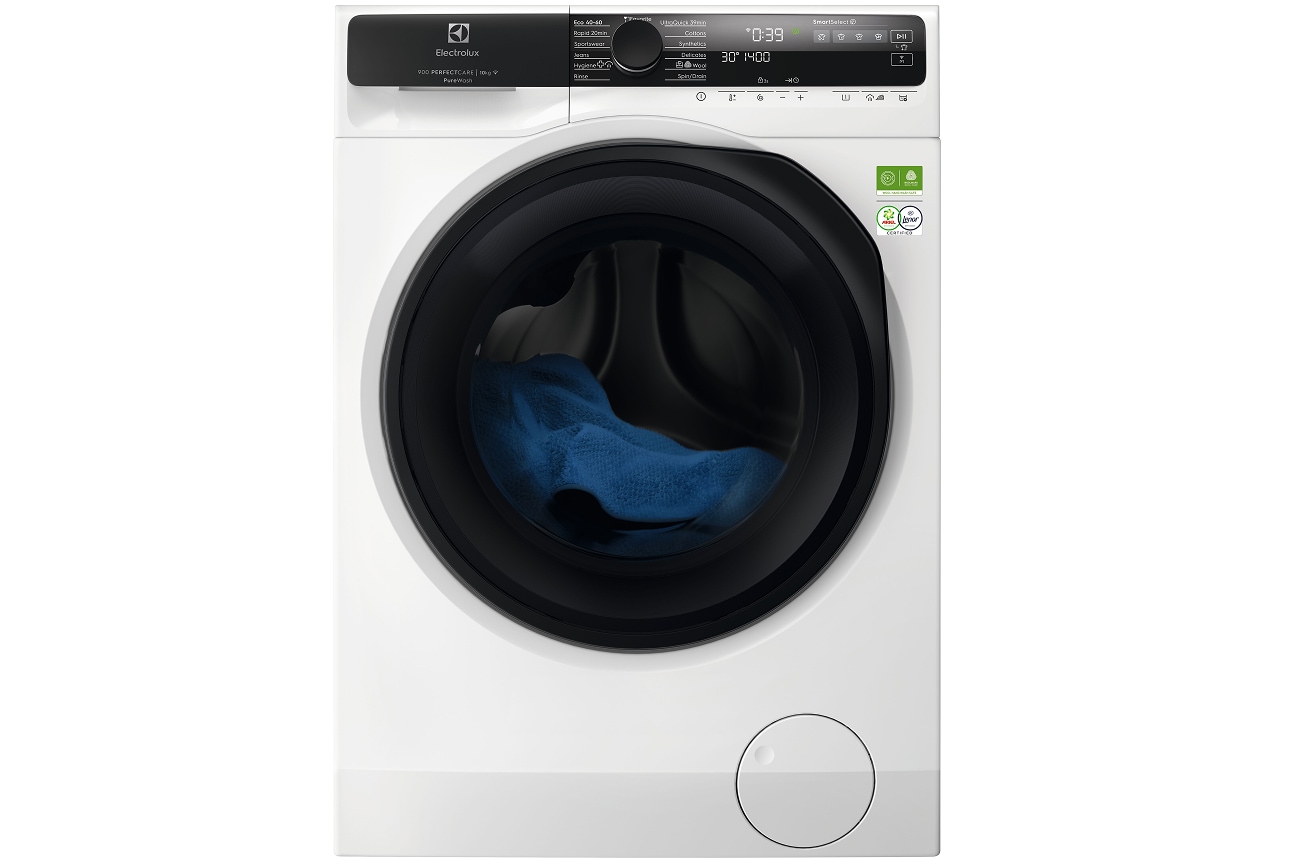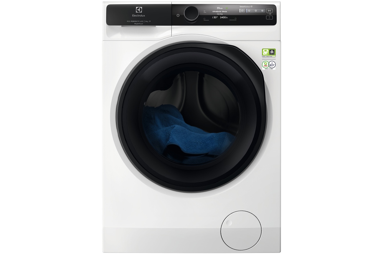 *Remiantis išoriniu 59 dėmių pašalinimo bandymu, naudojant "UltraQuick" 39 min. programą su 4 kg skalbinių, palyginti su lyderiaujančiais prekių ženklais Europoje, pasirinkus 1 val. trumpas programas ir 30 °C temperatūrą.