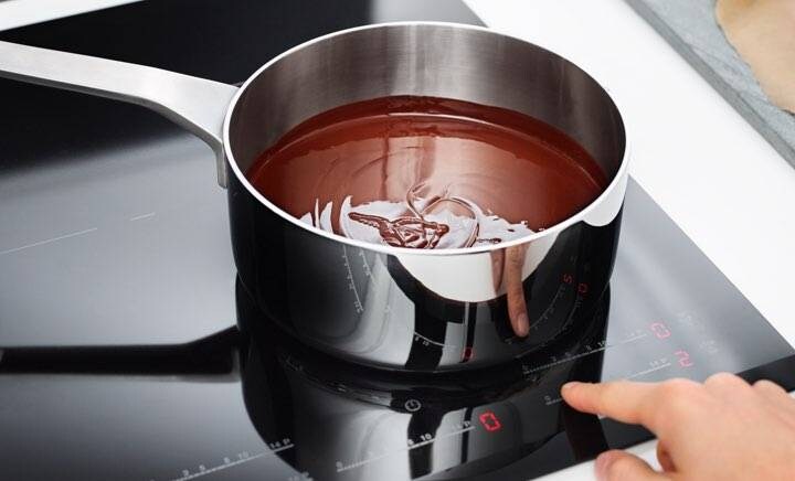 1Išlydykite šokoladąSuberkite pusę puodelio juodojo šokolado į puodą ir šildykite jį ant indukcinės kaitlentės kol gausite tirštą, vientisą masę.
