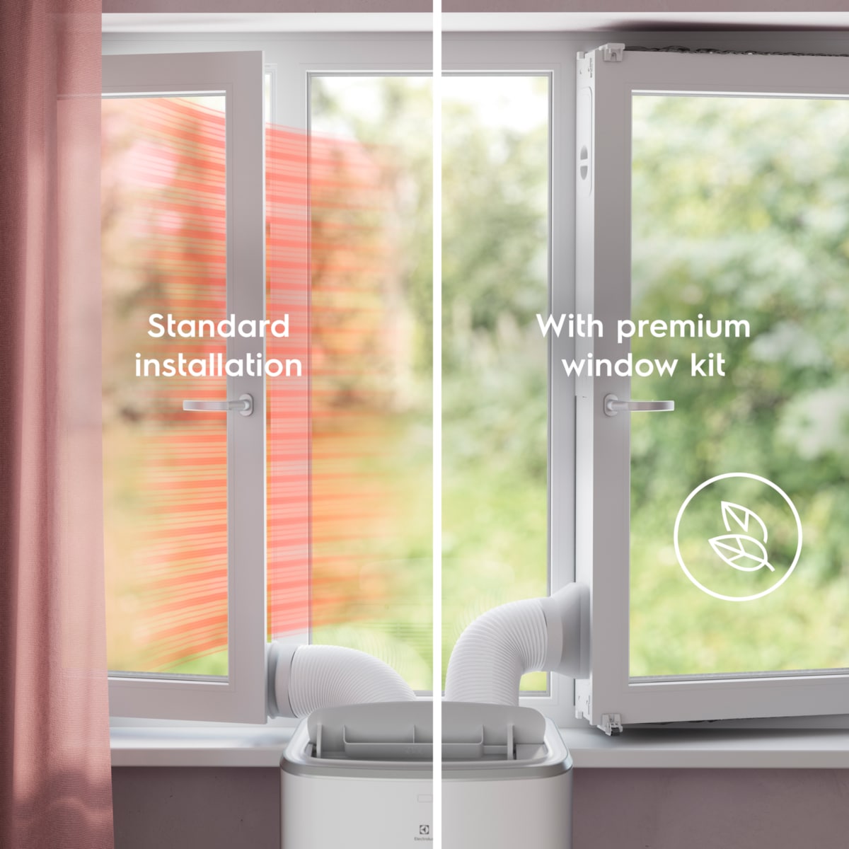 * Kai kambario temp. yra 26 °C, o nustatytoji – 24 °C, su rinkiniu „Premium Window“ nustatytąją temp. pasieksite per 19 min., o be jo – per 47 min. Vidinis bandymas 14 m² kambaryje, kuriame drėgmės lygis yra 60 %, o lauko temperatūra – 30 °C. Bandyta su „Electrolux 9K“ A klasės modeliu.